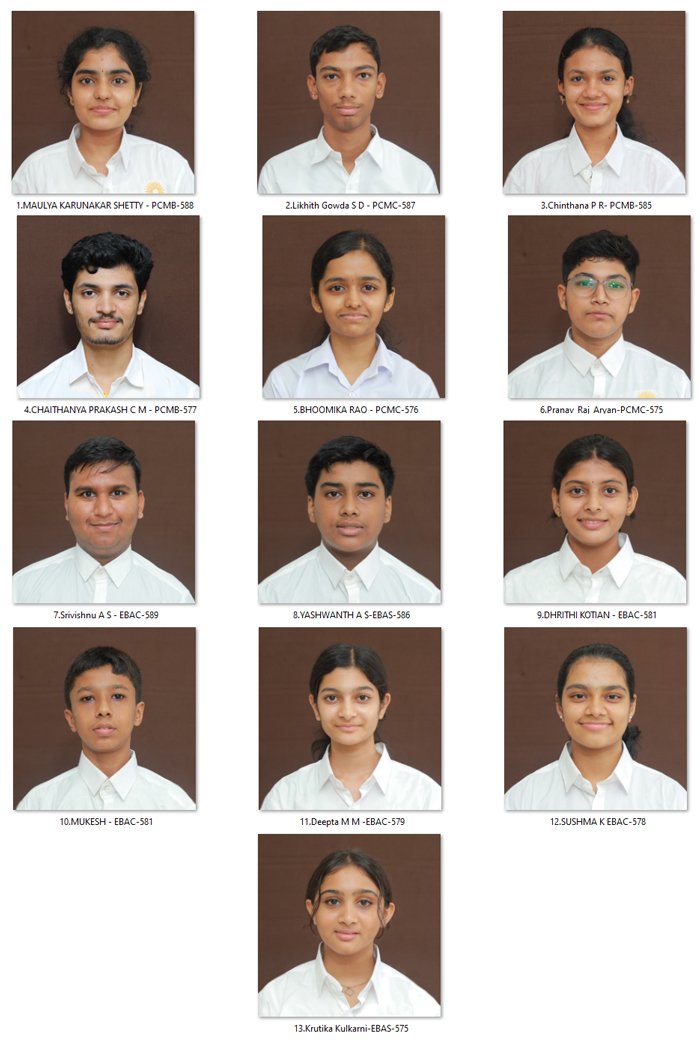 ವಿಜ್ಞಾನ ವಿಭಾಗದ ಪಿಸಿಎಮ್ಬಿಯಲ್ಲಿ ಶೆಟ್ಟಿ ಮೌಲ್ಯ ಕರುಣಾಕರ್ 588, ಪಿ.ಸಿ.ಎಂ.ಸಿ ಲಿಖಿತ್ ಗೌಡ ಎಸ್ ಡಿ 587, ಪಿ.ಸಿ.ಎಂ.ಬಿ ಚಿಂತನ ಪಿ.ಆರ್ 585, ಪಿ.ಸಿ.ಎಂ.ಬಿ ಚೈತನ್ಯ ಪ್ರಕಾಶ್ ಸಿ ಎಂ 577, ಪಿ.ಸಿ.ಎಂ.ಸಿ ಭೂಮಿಕ ರಾವ್ 576, ಪಿ.ಸಿ.ಎಂ.ಸಿ ಪ್ರಣವ್ ರಾಜ್ ಆರ್ಯನ್ 575 ಅಂಕಗಳಿಸಿರುತ್ತಾರೆ.