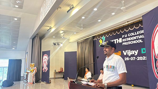 ವಿದ್ಯಾರ್ಥಿಗಳನ್ನುದ್ದೇಶಿಸಿ ಮಾತನಾಡಿದ ಇವರು  ಕಾರ್ಗಿಲ್ ಯುದ್ಧದಲ್ಲಿ ತಾವು ಭಾಗವಹಿಸಿದ ನೆನಪುಗಳನ್ನು ಹಂಚಿಕೊಂಡರು. ಬದುಕಿನಲ್ಲಿ ಹೀರೋ ಆಗಬೇಕೆಂದರೆ ಸೈನಿಕರಾಗಿ. ಸೈನಿಕರೇ ನಿಜವಾದ ಹೀರೋಗಳು. ಸೈನ್ಯದಲ್ಲಿರುವವರಿಗೆ ತಂದೆ, ತಾಯಿ, ಗೆಳೆಯ ಅನ್ನುವ ಸಂಬಂಧಕ್ಕಿಂತಲೂ ಸೈನಿಕರ ಸಮವಸ್ತ್ರದ ಮೇಲೆ ಅತೀವವಾದ ಭಾವನಾತ್ಮಕ ಸಂಬಂಧವಿರುತ್ತದೆ. ಭಾರತದ ಯಾವುದೇ ಒಬ್ಬ ಸೈನಿಕನಿಗೆ ಏನೇ ಆದರೂ ಇತರ ಸೈನಿಕರು ಕೆಚ್ಚೆದೆಯಿಂದ ಪ್ರತಿಭಟಿಸುತ್ತಾರೆ,  ಎದುರಾಳಿಗಳೊಂದಿಗೆ ಹೋರಾಡುತ್ತಾರೆ. ದೇಶಭಕ್ತಿಗೆ ಇನ್ನೊಂದು ಹೆಸರೇ ಸೈನಿಕ ಎಂದು ಹೇಳಿದರು. ಇದು ಭಾರತದ ಸೈನ್ಯ ಕಲಿಸಿಕೊಡುವ ಮೌಲ್ಯ. ಹಾಗಾಗಿ ಸೈನ್ಯ ಸೇರುವುದೇ ಇತರ ಎಲ್ಲಾ ಉದ್ಯೋಗಗಳಿಂದ ಶ್ರೇಷ್ಠವಾದ ಉದ್ಯೋಗ ಎಂದು ಹೇಳಿದರು.