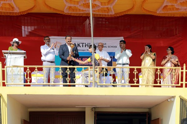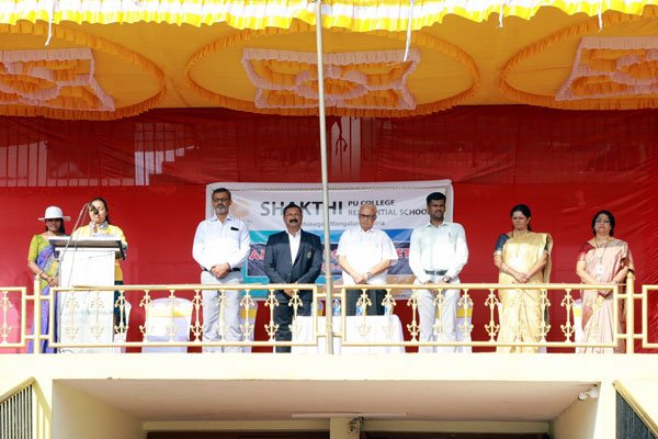 Sanjith Naik, Secretary of Shakthi Education trust appreciated the students marching in colours. He also praised the scout wing and asked the audience to find out the significance of the ceremonial light that the torch bearer carry in special events, even at Olympics.