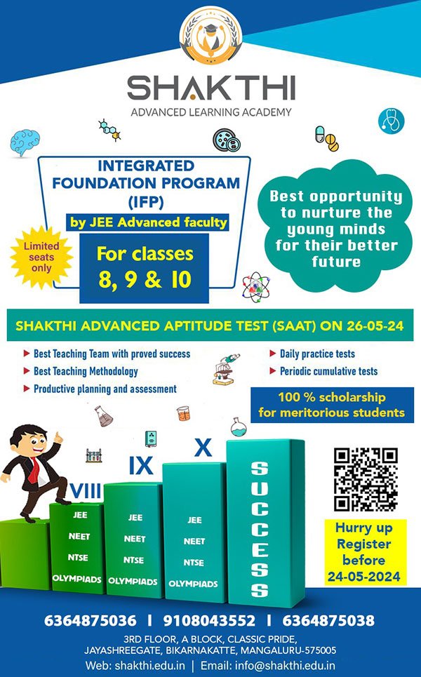 ಮಂಗಳೂರು : ಶಕ್ತಿನಗರದಲ್ಲಿರುವ ಶಕ್ತಿ ವಿದ್ಯಾಸಂಸ್ಥೆಯ ಅಂಗ ಸಂಸ್ಥೆ ’ಶಕ್ತಿ ಎಡ್ವಾನ್ಸ್ಡ್ ಲರ್ನಿಂಗ್ ಅಕಾಡೆಮಿ’ಯು ಜೂನ್ ತಿಂಗಳಿನಿಂದ ವರ್ಷ ಪೂರ್ತಿ ಶಕ್ತಿ ರೆಸಿಡೆನ್ಶಿಯಲ್ ಶಾಲೆ ಮತ್ತು ನಗರದ ಇತರೆ ಶಾಲೆಗಳ ಹೈಸ್ಕೂಲ್ (8, 9 ಮತ್ತು 10ನೇ) ತರಗತಿಯ ವಿದ್ಯಾರ್ಥಿಗಳಿಗೆ ಪ್ರತಿ...