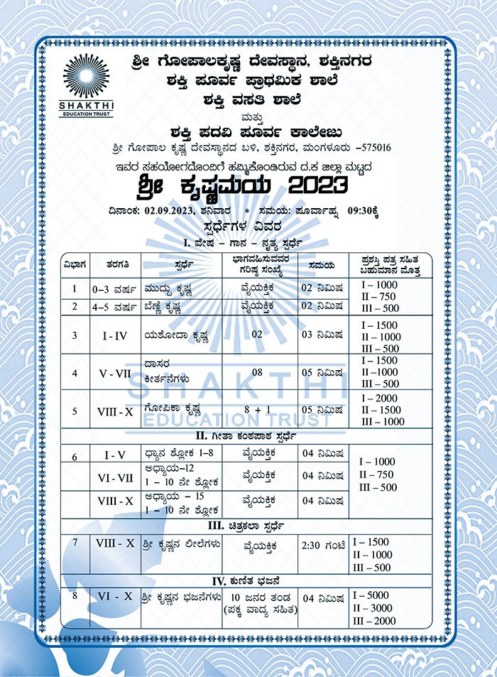 ಶ್ರೀ ಗೋಪಾಲಕೃಷ್ಣ ದೇವಸ್ಥಾನ, ಶಕ್ತಿನಗರ, ಶಕ್ತಿ ಪೂರ್ವ ಪ್ರಾಥಮಿಕ ಶಾಲೆ, ಶಕ್ತಿ ವಸತಿ ಶಾಲೆ ಮತ್ತು ಶಕ್ತಿ ಪಪೂ ಕಾಲೇಜು ವತಿಯಿಂದ ಜಿಲ್ಲಾ ಮಟ್ಟದ ಕೃಷ್ಟಮಯ – 2023 ಕೃಷ್ಣ ವೇಷ ಸ್ಪರ್ಧೆಯನ್ನು ದಿನಾಂಕ 2-9-2023 ರ ಶನಿವಾರ ಪೂರ್ವಾಹ್ನ 9...