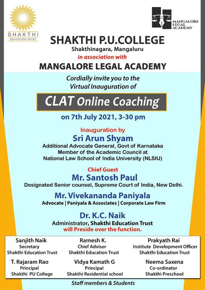 Shakthi Commerce Advanced Learning of Shakthi PU College in association with Mangalore Legal Academy will provide online coaching for CLAT aspirants. The inauguration of the same will be held on...