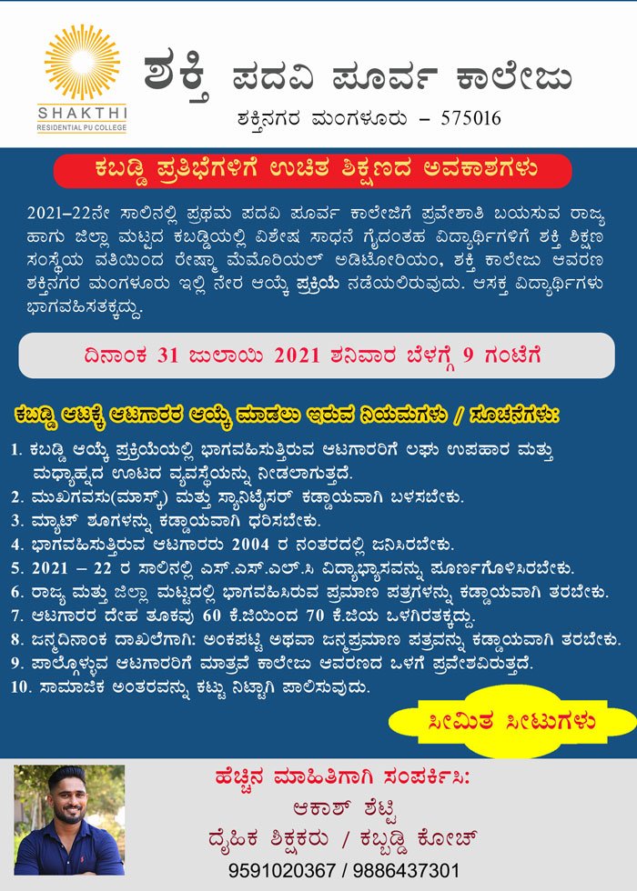 ಶಕ್ತಿನಗರದ ಶಕ್ತಿ ಪದವಿ ಪೂರ್ವಕಾಲೇಜಿನ ವಾಣಿಜ್ಯ ವಿಭಾಗದಲ್ಲಿ 2021-22 ನೇ ಸಾಲಿನಲ್ಲಿ ಕಬಡ್ಡಿ ಪ್ರತಿಭೆಗಳಿಗೆ ಉಚಿತ ಶಿಕ್ಷಣದ ಅವಕಾಶವನ್ನು ಕಲ್ಪಿಸಲಾಗಿದೆ. ದಿನಾಂಕ 31-7-2021 ಶನಿವಾರ ಬೆಳಗ್ಗೆ 9 ಗಂಟೆಗೆ ಶಕ್ತಿ ಕಾಲೇಜಿನ ರೇಷ್ಮಾ ಮೆಮೋರಿಯಲ್ ಆಡಿಟೋರಿಯಂನಲ್ಲಿ ಕಬಡ್ಡಿ ನೇರ ಆಯ್ಕೆ ಪ್ರಕ್ರಿಯೆ...