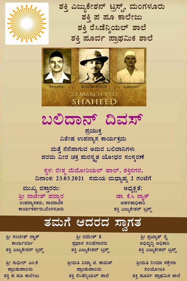 ಶಕ್ತಿ ವಿದ್ಯಾ ಸಂಸ್ಥೆಯಲ್ಲಿ ನಾಳೆ ಬಲಿದಾನ ದಿವಸದ ಪ್ರಯುಕ್ತ ವಿಶೇಷ ಉಪನ್ಯಾಸ ಕಾರ್ಯಕ್ರಮ