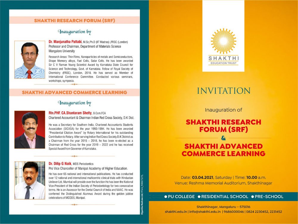 Shakthi Pre-School, Shakthi Residential School and Shakthi PU College will witness another milestone as the Shakthi research Forum and Shakthi Commerce Advanced Learning gets inaugurated on Saturday 3rd April 2021...