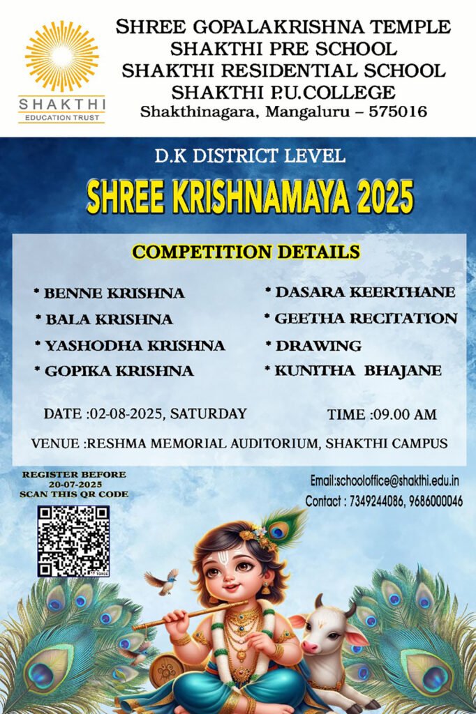 ಶ್ರೀ ಗೋಪಾಲಕೃಷ್ಣ ದೇವಸ್ಥಾನ, ಶಕ್ತಿನಗರ, ಶಕ್ತಿ ಪೂರ್ವ ಪ್ರಾಥಮಿಕ ಶಾಲೆ, ಶಕ್ತಿ ವಸತಿ ಶಾಲೆ ಮತ್ತು ಶಕ್ತಿ ಪಪೂ ಕಾಲೇಜು ವತಿಯಿಂದ ಜಿಲ್ಲಾ ಮಟ್ಟದ ಕೃಷ್ಟಮಯ – 2025 ಕೃಷ್ಣ ವೇಷ ಸ್ಪರ್ಧೆಯನ್ನು ದಿನಾಂಕ 2-8-2025 ರ ಶನಿವಾರ ಪೂರ್ವಾಹ್ನ 9...