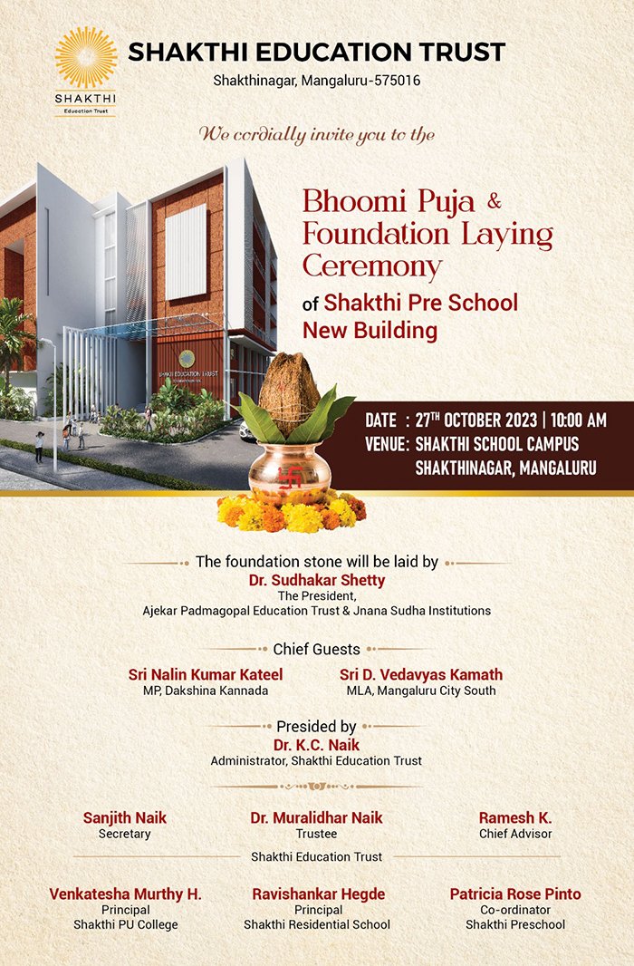 ಈ ಕಾರ್ಯಕ್ರಮದ ಭೂಮಿ ಪೂಜೆಯನ್ನು ಅಜೇಕರ್ ಪದ್ಮಗೋಪಾಲ ಎಜ್ಯುಕೇಶನ್ ಟ್ರಸ್ಟ್ ಮತ್ತು ಜ್ಞಾನ ಸುಧಾ ಸಂಸ್ಥೆ ಕಾರ್ಕಳದ ಅಧ್ಯಕ್ಷರಾದ ಡಾ. ಸುಧಾಕರ ಶೆಟ್ಟಿ ನೆರವೆರಿಸಲಿದ್ದಾರೆ. ಮುಖ್ಯ ಅತಿಥಿಗಳಾಗಿ ಮಂಗಳೂರು ದಕ್ಷಿಣದ ಶಾಸಕರಾದ ಡಿ. ವೇದವ್ಯಾಸ್ ಕಾಮತ್ ಆಗಮಿಸಲಿದ್ದಾರೆ. ಅಧ್ಯಕ್ಷತೆಯನ್ನು ಶಕ್ತಿ ವಿದ್ಯಾ ಸಂಸ್ಥೆಯ ಸಂಸ್ಥಾಪಕರಾದ ಡಾ. ಕೆ. ಸಿ. ನಾೖಕ್ ವಹಿಸಲಿದ್ದಾರೆ.