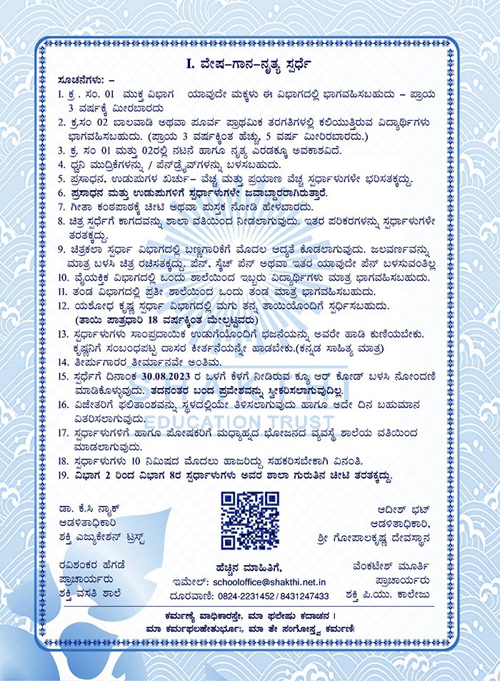 ವಿಭಾಗ 1 ರಲ್ಲಿ 3 ವರ್ಷ ತನಕದ ಮಕ್ಕಳಿಗೆ ಮುದ್ದುಕೃಷ್ಣ, 4 ರಿಂದ 5 ವರ್ಷ ತನಕದ ಮಕ್ಕಳಿಗೆ ಬೆಣ್ಣೆ ಕೃಷ್ಣ, 1 ರಿಂದ 4 ನೇ ತರಗತಿಯ ಮಕ್ಕಳಿಗೆ ಯಶೋದ ಕೃಷ್ಣ, 5 ರಿಂದ 7ನೇ ತರಗತಿಯ ಮಕ್ಕಳಿಗೆ ದಾಸರ ಕೀರ್ತನೆಗಳು, 8 ರಿಂದ 10 ನೇ ತರಗತಿಯ ಮಕ್ಕಳಿಗೆ ಗೋಪಿಕಾ ಕೃಷ್ಣ. ಗೀತಾ ಕಂಠಪಾಠ ಸ್ಪರ್ಧೆಯಲ್ಲಿ, 1-5 ನೇ ತರಗತಿಯ ಮಕ್ಕಳಿಗೆ ಧ್ಯಾನ ಶ್ಲೋಕ 1-8, 6 ರಿಂದ 7 ನೇ ತರಗತಿಯ ಮಕ್ಕಳಿಗೆ ಅಧ್ಯಾಯ – 12 (1-10 ನೇ ಶ್ಲೋಕ) 8 ರಿಂದ 10 ನೇ ತರಗತಿಯ ಮಕ್ಕಳಿಗೆ ಅಧ್ಯಾಯ – 15, 1-10 ನೇ ಶ್ಲೋಕ. ಚಿತ್ರಕಲಾ ಸ್ಪರ್ಧೆ 8 ರಿಂದ 10 ಶ್ರೀ ಕೃಷ್ಣನ ಲೀಲೆಗಳು. ಕುಣಿತ ಭಜನೆ 6 ರಿಂದ 10 ತರಗತಿ ಶ್ರೀ ಕೃಷ್ಣನ ಭಜನೆಗಳು 10 ಜನರ ತಂಡಕ್ಕೆ 4 ನಿಮಿಷ ಅವಕಾಶ ನೀಡಲಾಗಿದೆ. ಒಂದು ಶಾಲೆಯಿಂದ ಎಷ್ಟು ತಂಡಗಳಿಗೂ ಭಾಗವಹಿಸುವ ಅವಕಾಶವಿದೆ. ವೆಬ್ಸೈಟ್ ನೋಂದಣಿಗೆ ಹಾಗೂ ಹೆಚ್ಚಿನ ಮಾಹಿತಿಗೋಸ್ಕರ Shakthi.edu.in ಮತ್ತು ದೂರವಾಣಿ ಸಂಖ್ಯೆ 0824-2231452/8431247433 ಗೆ ಸಂಪರ್ಕಿಸಲು ಕೋರಲಾಗಿದೆ.