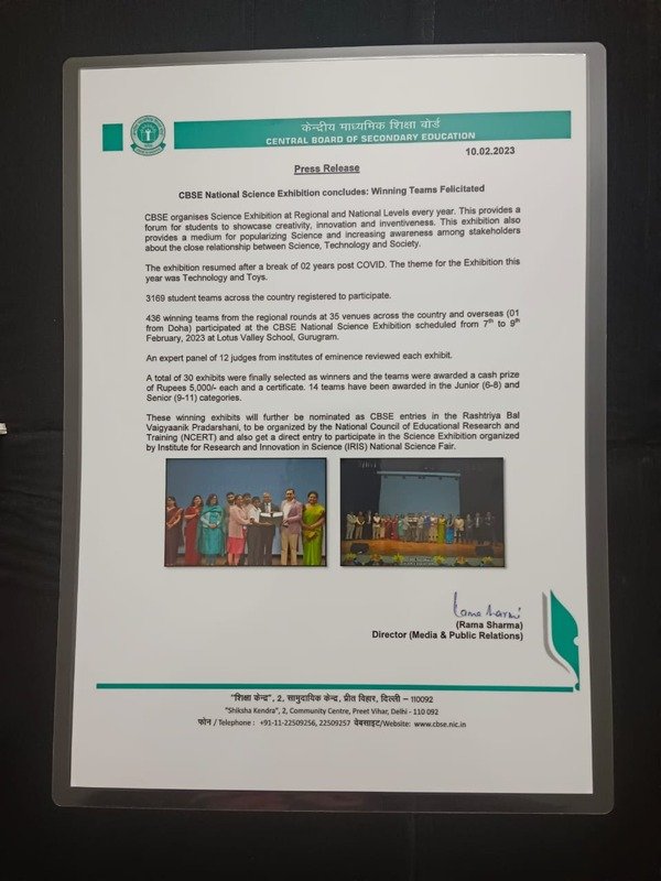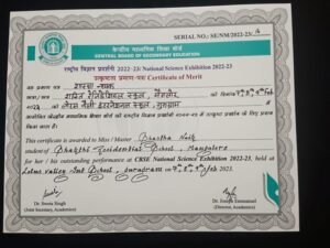He bagged a gold medal in “The CBSE NATIONAL SCIENCE FAIR 2022-2023” held at Lotus Valley International School, Gurugram, Haryana.