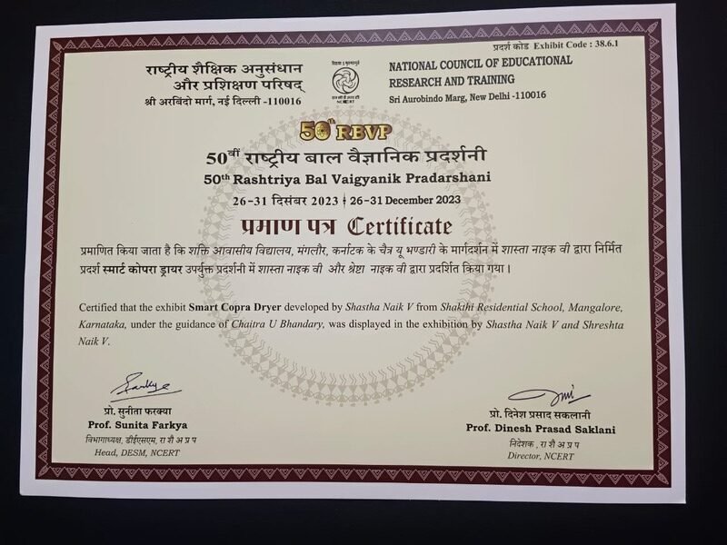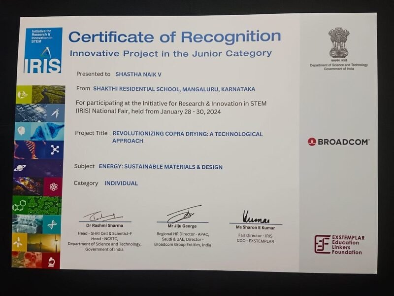 Shakthi Residential School, Shastha Naik Vorkady of grade 7 participated at “The REGENERON ISEF INTERNATIONAL SCIENCE FAIR 2024” at Los Angeles, California, USA from 10th May to 19th May 2024.He did an Innovative Revolutionizing Smart Copra Dryer science model under the Topic “Energy: Sustainable material and Design using advanced technological aproach”.